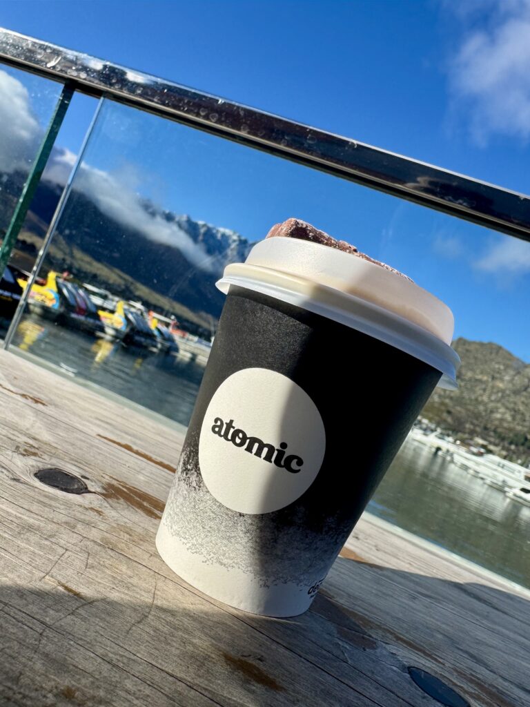 フランクトンマリーナの桟橋にあるカフェで湖と山々の景色を眺めながらコーヒーが楽しめます。