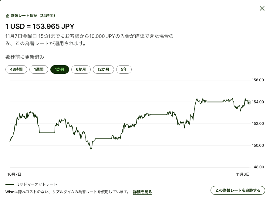 Wiseではリアルタイム為替レートを採用しており、手数料が明確に表示されます。