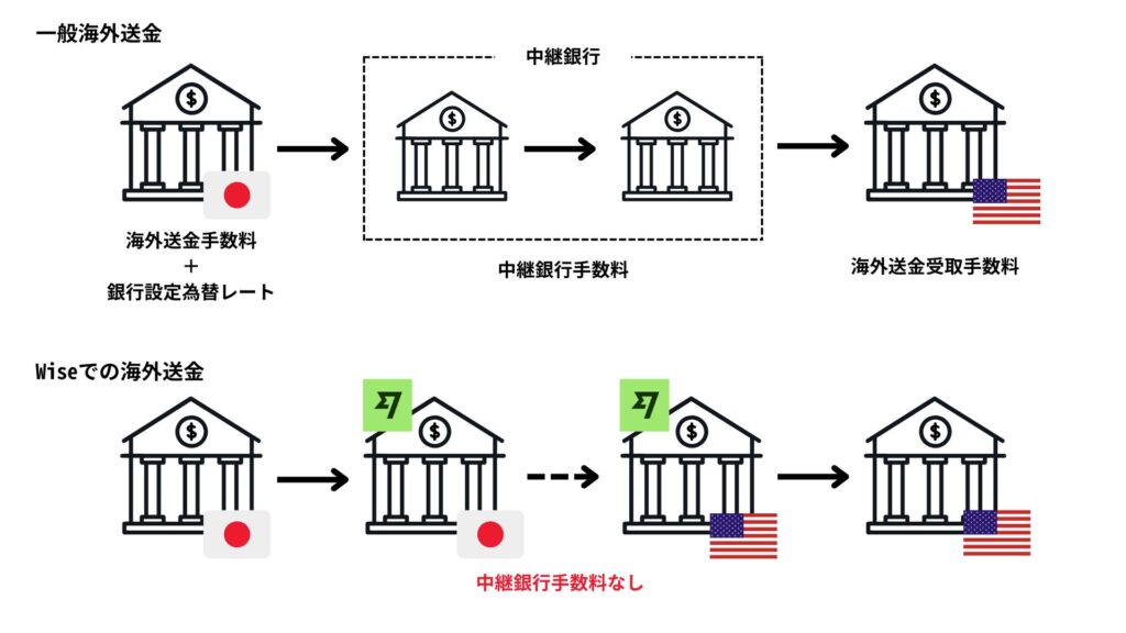 つまり、国際送金ではなく国内送金を2回行っているのと同じになります。