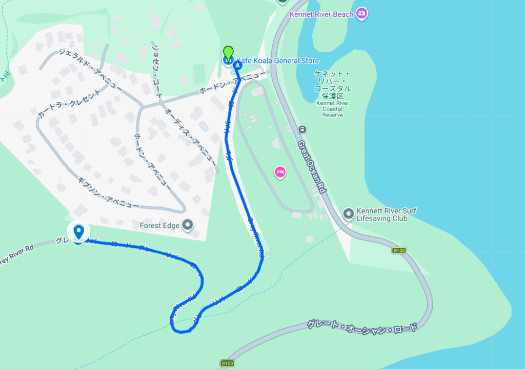 - Great River Roadを車で数分登った先にあるユーカリ林(下の地図参考)